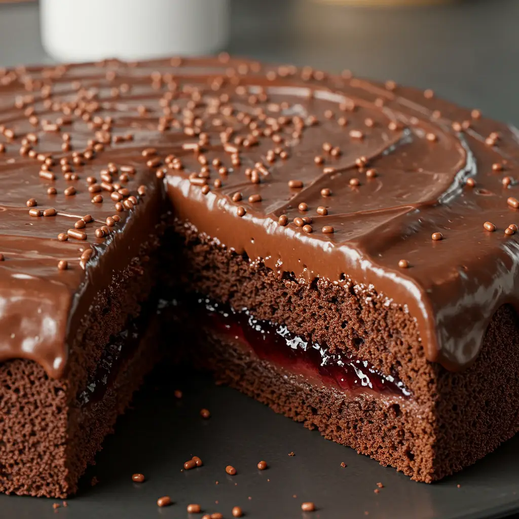 Um bolo de chocolate úmido e leve, com um delicioso recheio de geléia de morango e cobertura cremosa de chocolate. Perfeito para um lanche da tarde ou comemoração especial! Experimente!