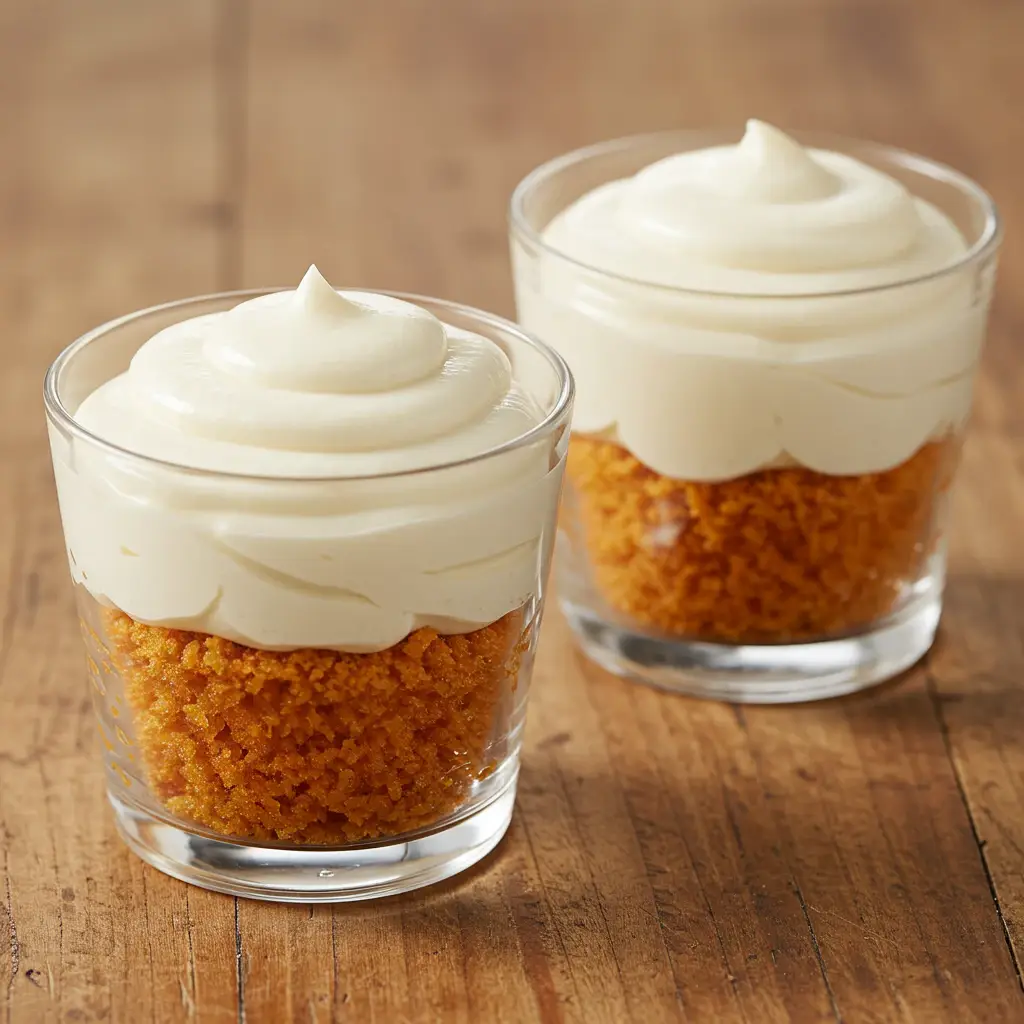 Um delicioso pote individual com bolo de laranja esfarelado e um irresistível creme de leite condensado, leite em pó e chantilly. Doce perfeito para um lanche da tarde ou sobremesa leve.