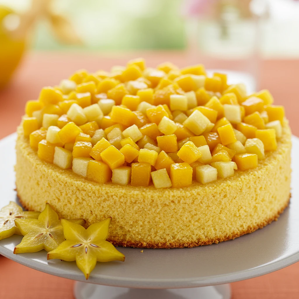 Bolo de Manga com Cremoso de Manga e Salada de Frutas