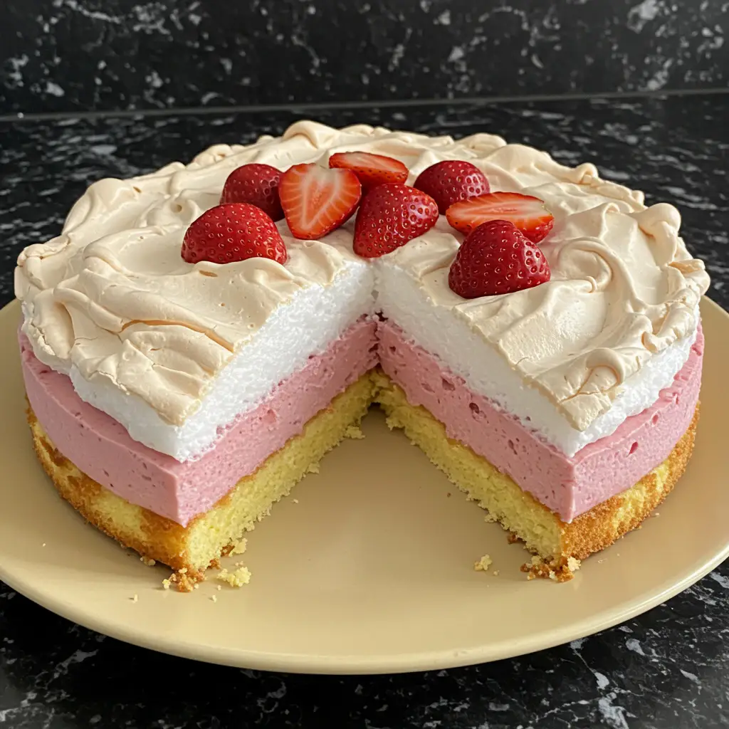 Um bolo de morango irresistível! Camadas fofas de bolo, um recheio cremoso de mousse de morango e um delicado merengue para finalizar. Uma explosão de sabor em cada garfada.