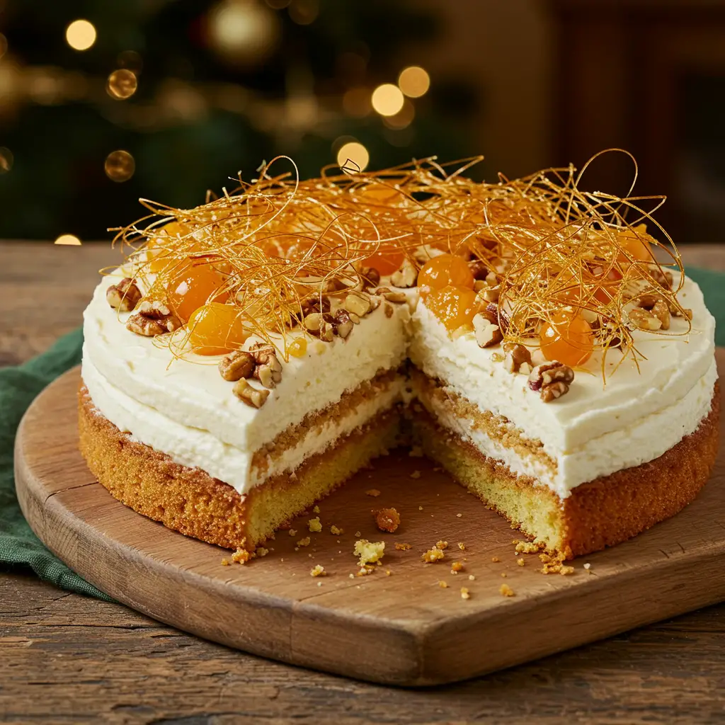 Um bolo de pão-de-ló macio, recheado com creme confeiteiro e decorado com fondant, fios de ovos, frutas cristalizadas e nozes. Uma sobremesa festiva e deliciosa para o Natal!