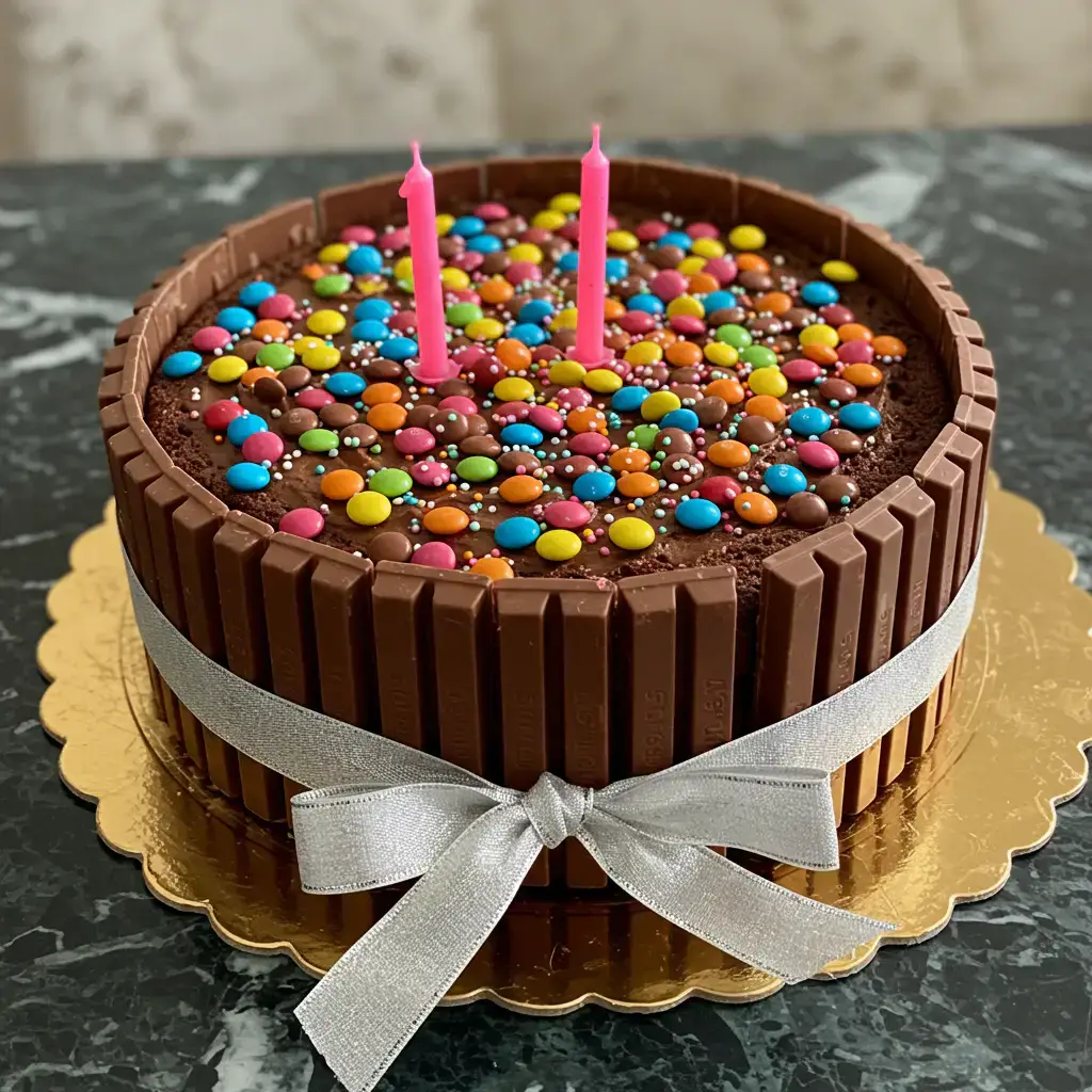 Um bolo de chocolate úmido e irresistível, coberto com um delicioso creme de morangos e palitos de chocolate Trento, simulando um Kit Kat. Perfeito para festas e ocasiões especiais!