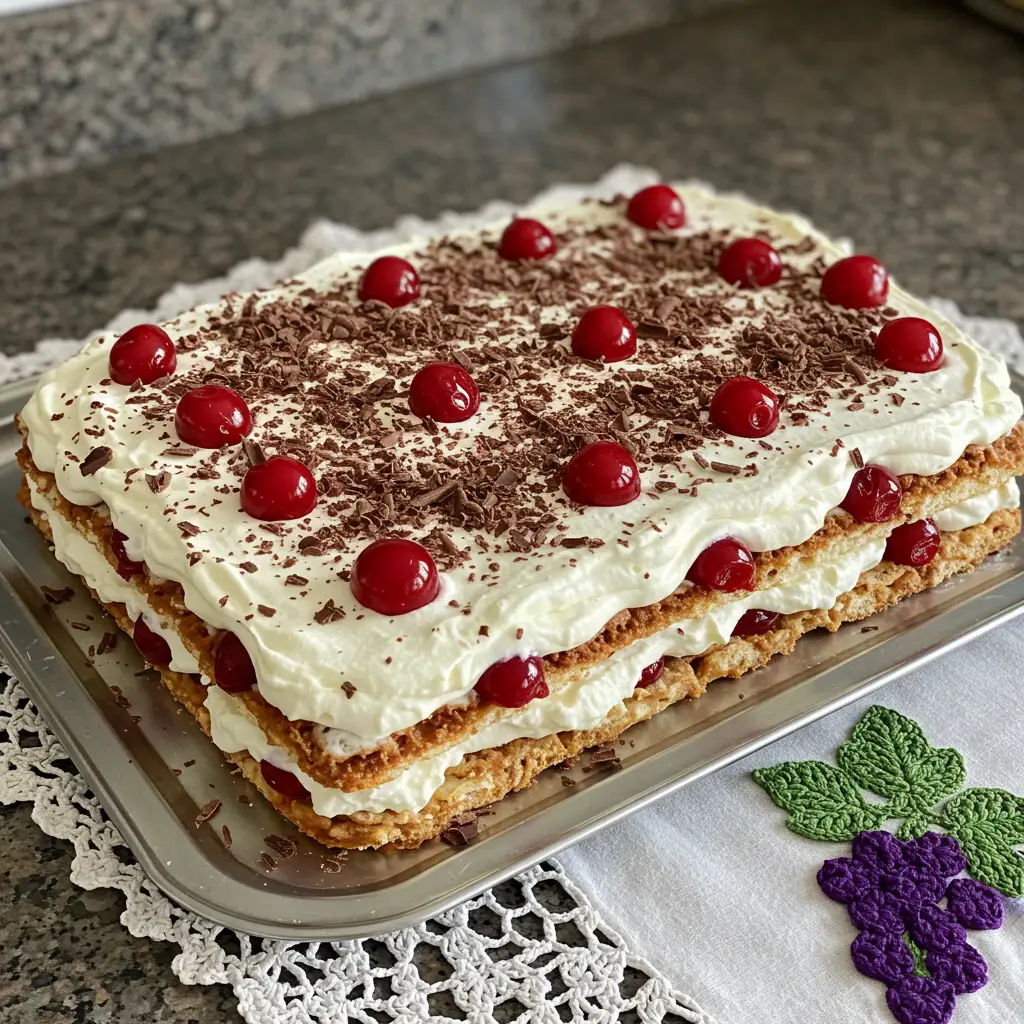 Molhe cada camada com a calda de cereja e licor.