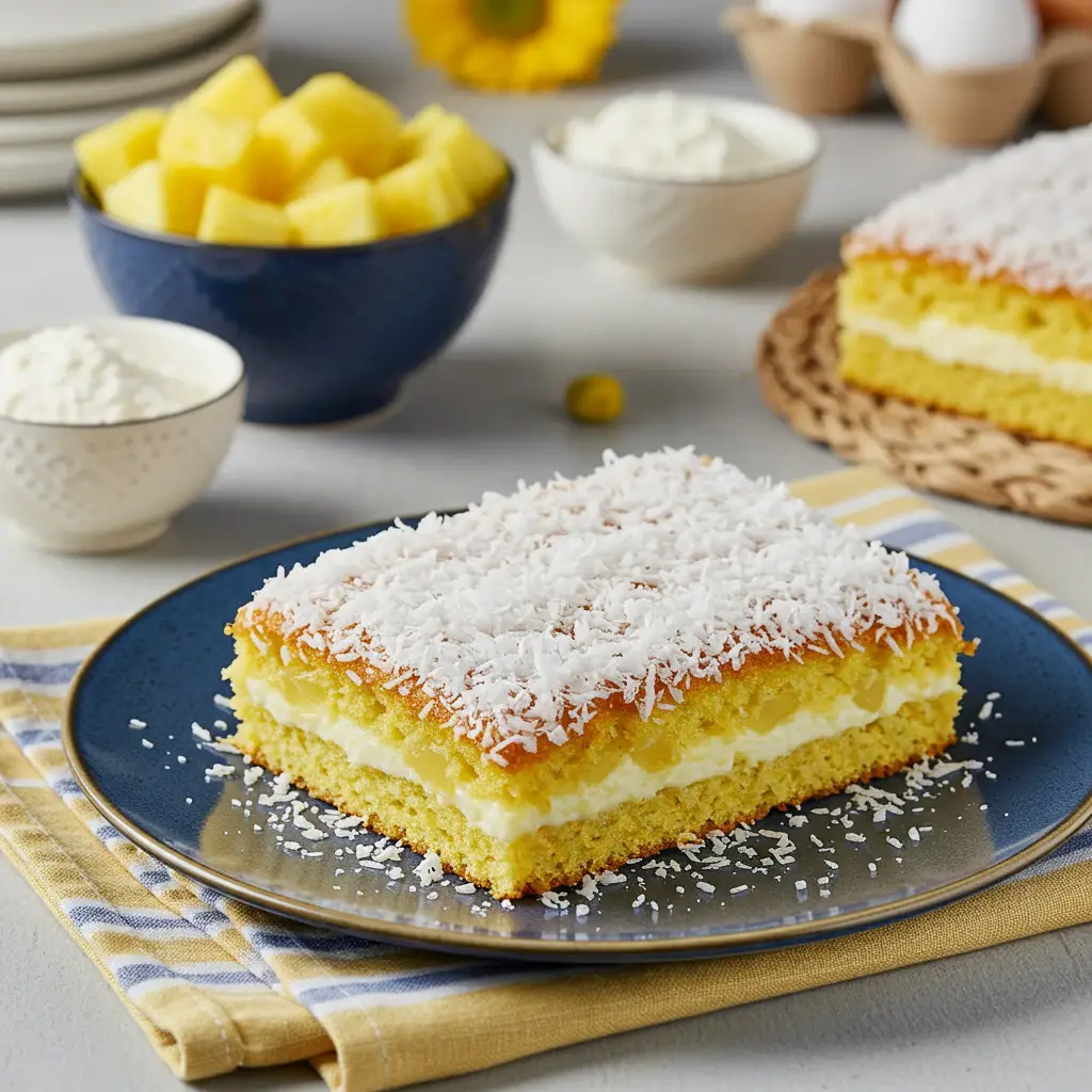 Um bolo úmido e perfumado de abacaxi, coberto com um irresistível creme de leite condensado e coco. Perfeito para um lanche da tarde ou sobremesa especial! Experimente!