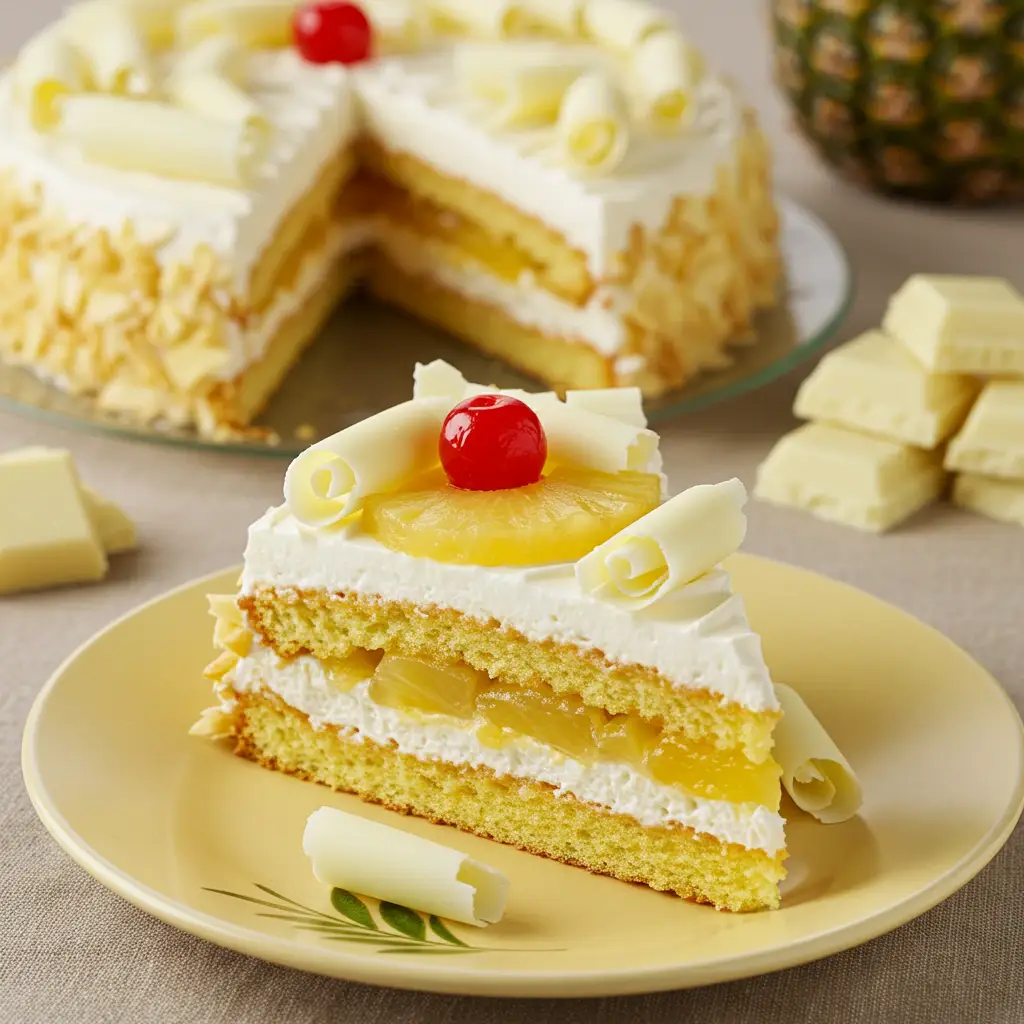 Um bolo úmido e delicioso, com camadas de abacaxi caramelizado, cremoso chocolate branco e coco fresco. Perfeito para um lanche da tarde ou sobremesa especial.