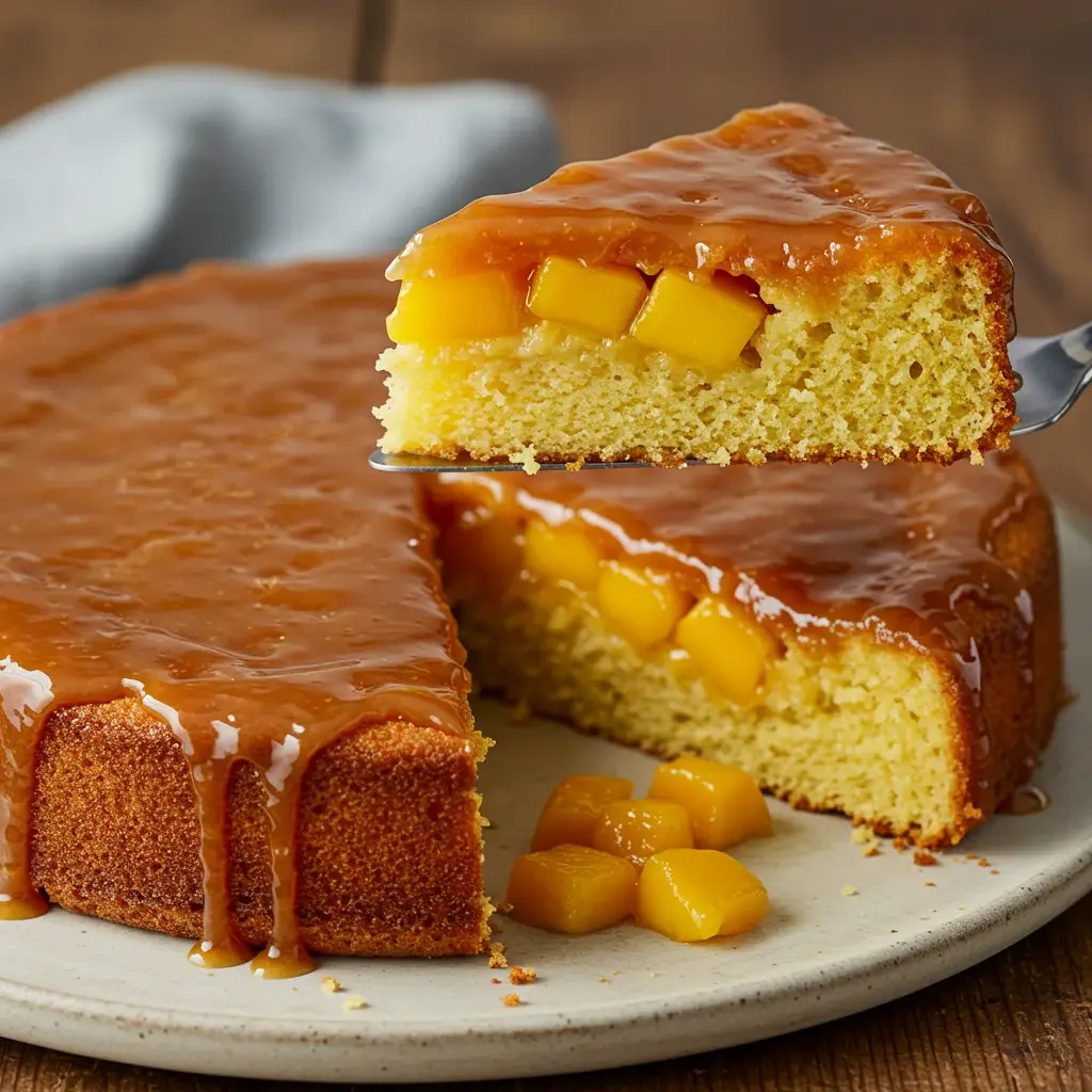 Um bolo invertido delicioso e fácil de fazer! A manga suculenta contrasta perfeitamente com a calda caramelizada e o bolo fofinho. Uma sobremesa perfeita para qualquer ocasião.