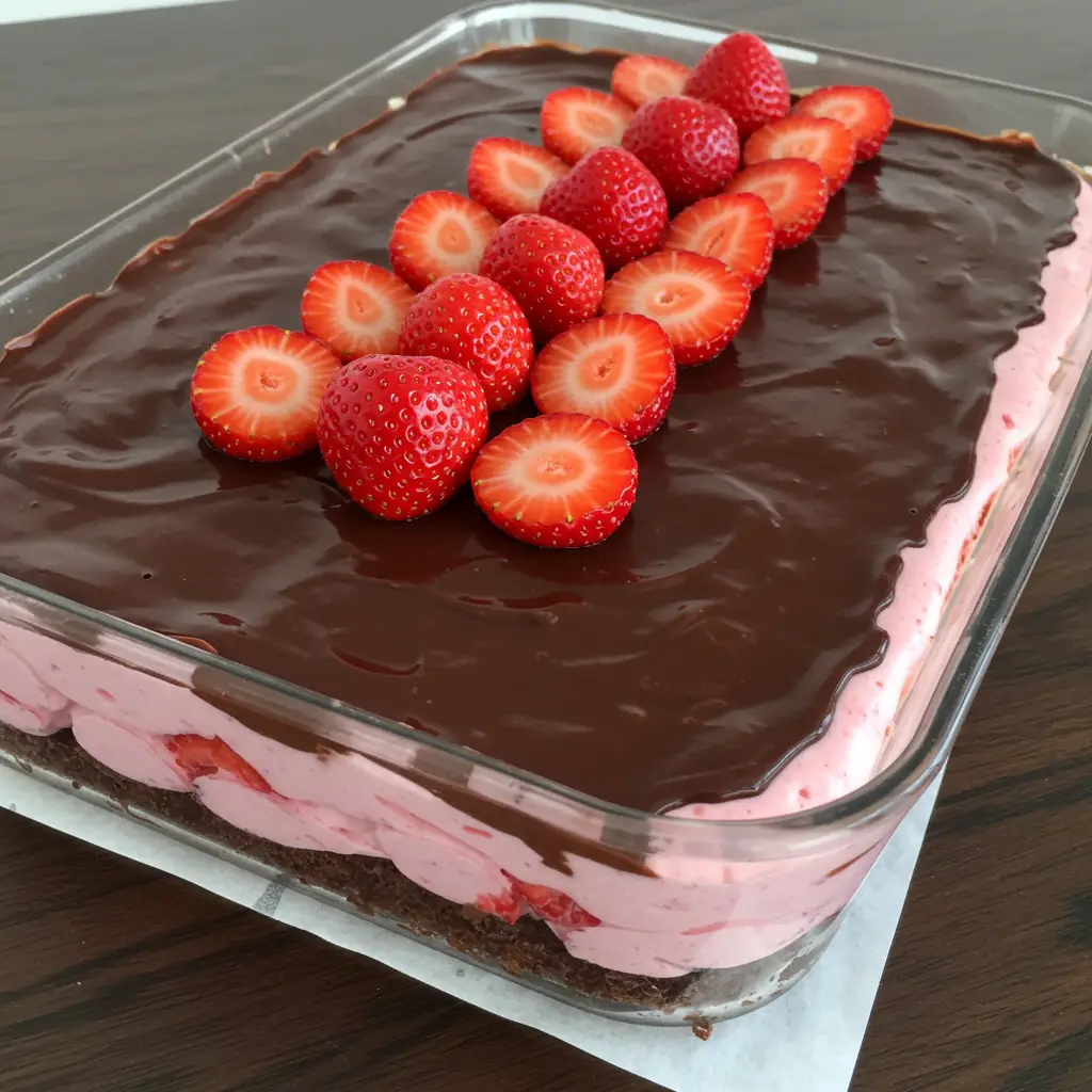 Um bolo de chocolate úmido e macio, com um irresistível mousse de morango e cobertura cremosa de chocolate meio amargo. Uma explosão de sabores que encanta o paladar.