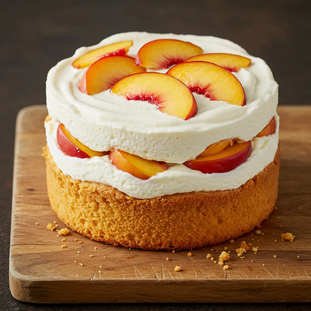 Monte o bolo em uma forma ou travessa, intercalando camadas de bolo, mousse de pêssego e calda.