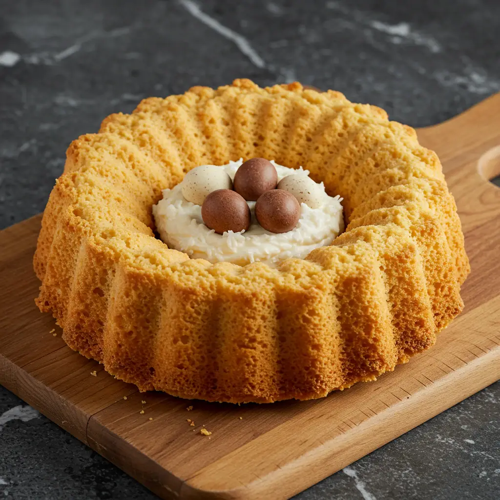 Um bolo fofinho e saboroso em formato de ninho, perfeito para a Páscoa! Recheado com um delicioso creme de coco e decorado com ovinhos de chocolate. Uma receita deliciosa e fácil de fazer.