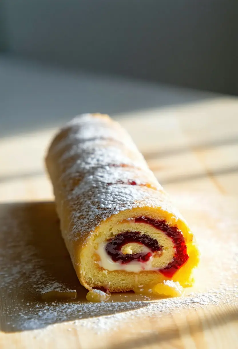 Um bolo esponjoso leve e fofo enrolado com uma camada de geléia doce, perfeito para qualquer ocasião.
