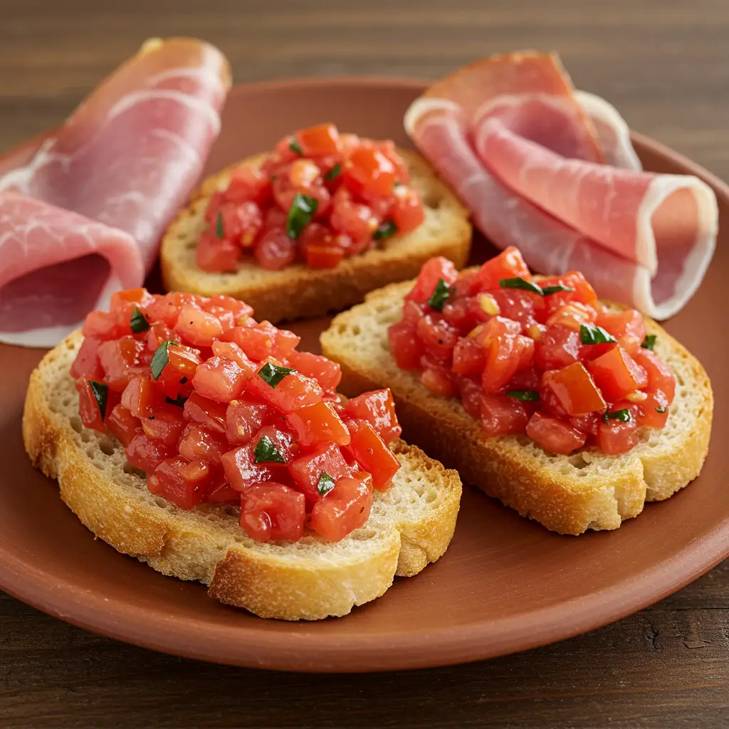 Uma entrada italiana deliciosa e fácil de preparar! Fatias de pão italiano tostadas, cobertas com tomate suculento, presunto Parma, manjericão fresco e um toque de azeite extra virgem. Perfeita para um jantar romântico ou um encontro com amigos.