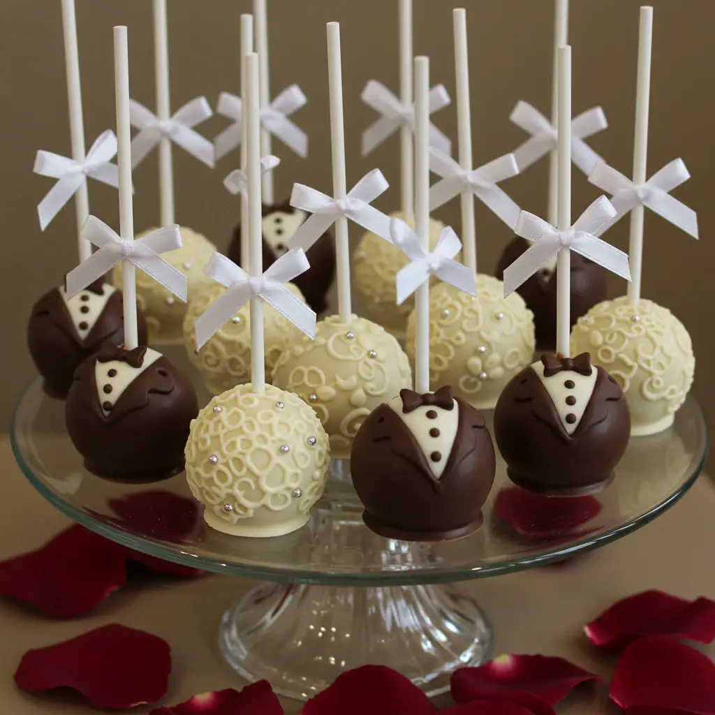 Deliciosos cake pops em formato de noivinhos, com um irresistível sabor de coco queimado. Perfeitos para festas e eventos especiais. Uma combinação deliciosa de bolo, coco e chocolate.