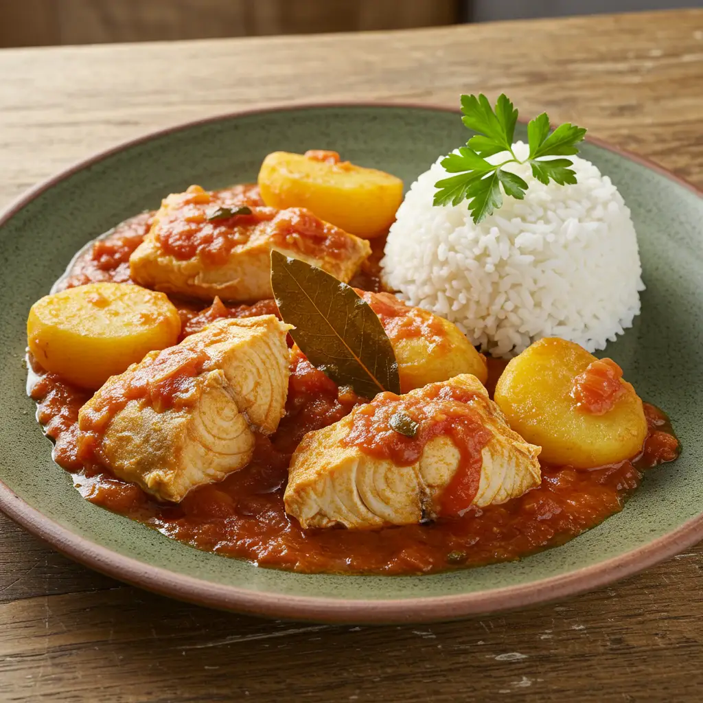 Um prato brasileiro saboroso e reconfortante! Peixe branco suculento em um molho cremoso de tomate, batatas macias e temperos vibrantes. Uma refeição completa e deliciosa.
