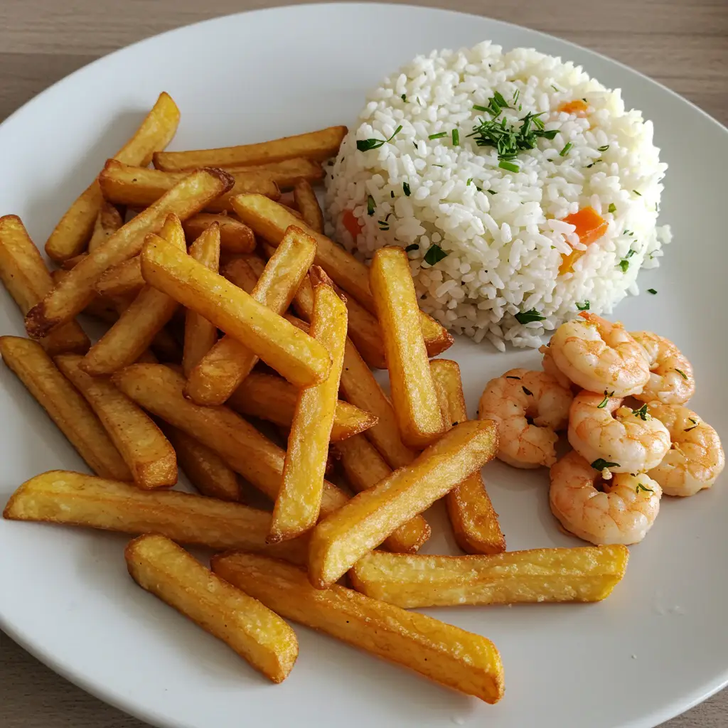Um prato saboroso e fácil de preparar! Camarões suculentos salteados no azeite de alho, acompanhados de arroz soltinho e batatas fritas crocantes. Uma combinação perfeita de texturas e sabores.
