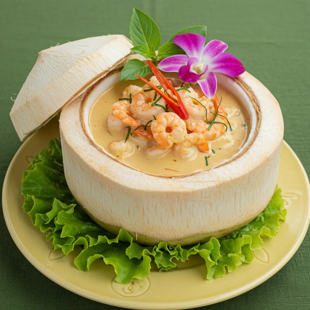 Deliciosos camarões em um cremoso molho de coco, finalizado com hortelã fresca e servido em metades de coco. Uma explosão de sabor tropical que vai te surpreender!