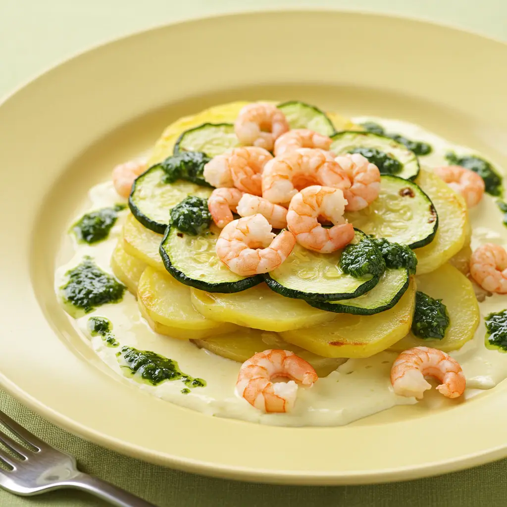 Deliciosos camarões salteados sobre um gratinado de batatas e abobrinha, regado com uma irresistível salsa verde. Uma explosão de sabores que vai te surpreender!