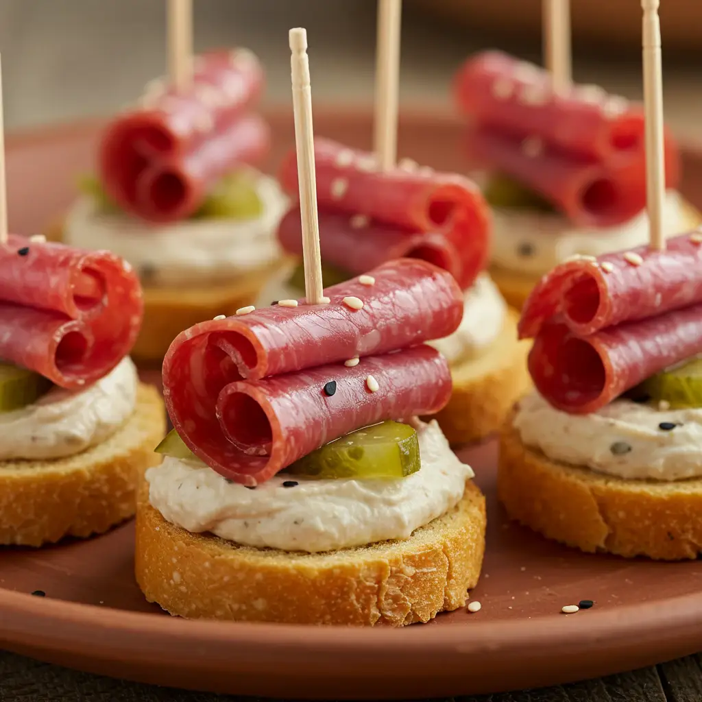 Deliciosos canapés italianos, perfeitos para um aperitivo sofisticado. A combinação da ricota cremosa com o salaminho e azeitonas verdes é irresistível. Fácil de preparar e com um toque de elegância.