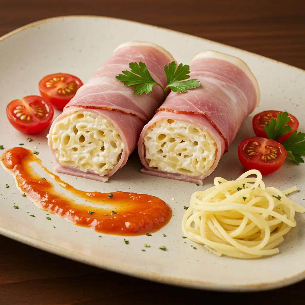 Uma releitura deliciosa do clássico canelone! Macarrão cabelo de anjo envolvendo um saboroso recheio cremoso de presunto, mussarela e catupiry, coberto com um suculento molho de tomate. Uma explosão de sabores que vai te conquistar!