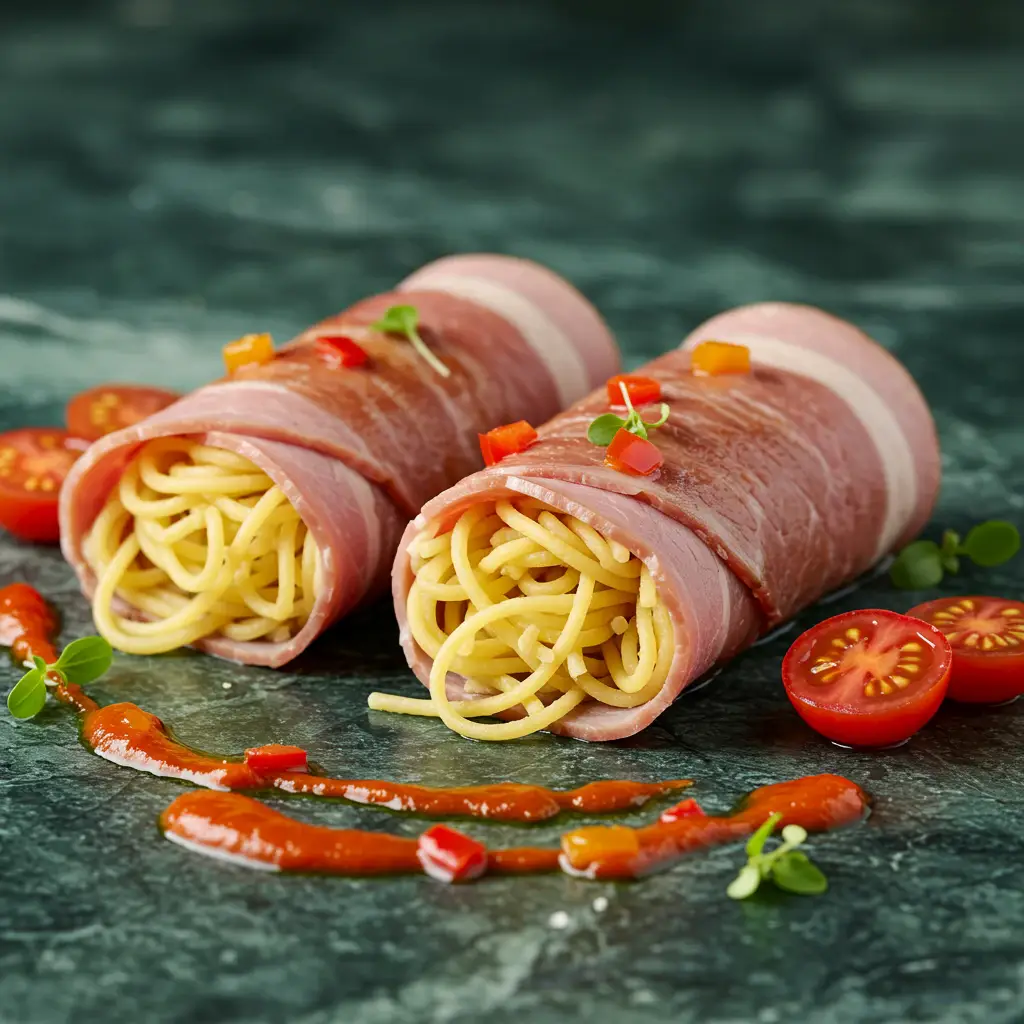 Sobre uma superfície plana, coloque uma fatia de presunto, sobre ela uma fatia de queijo e um punhado do macarrão temperado.