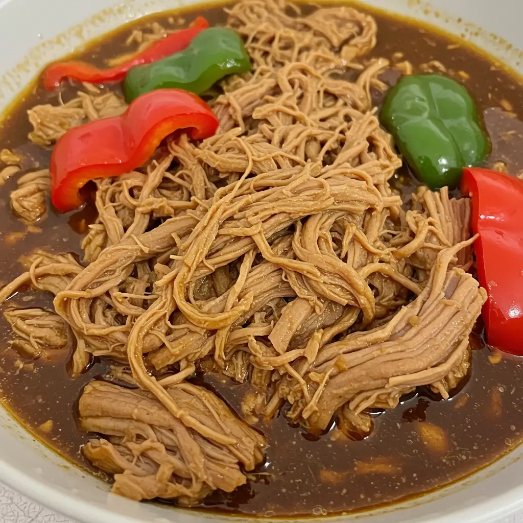 Adicione a carne desfiada ao molho e misture bem. Deixe ferver por mais 10 minutos, ou até que os pimentões estejam macios e o molho tenha engrossado.