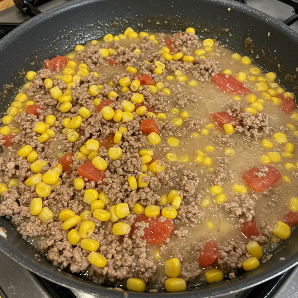 Adicione o caldo de carne e os tomates picados. Misture bem e deixe cozinhar por cerca de 15 minutos, ou até a carne estar cozida e o molho engrossar levemente.