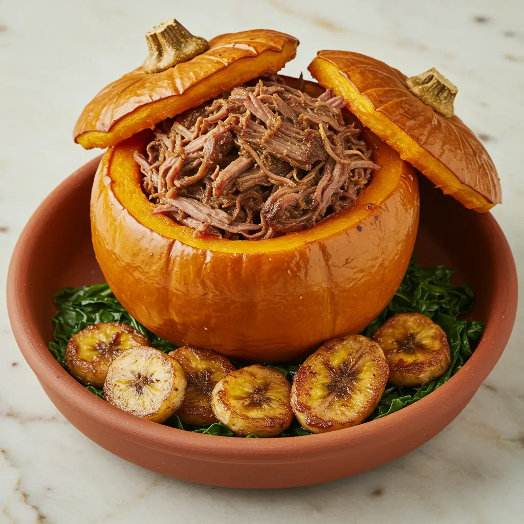 Um prato brasileiro reconfortante e saboroso! Carne seca desfiada, cozida lentamente e recheando uma moranga assada, acompanhada de bananas com bacon. Uma explosão de sabores!
