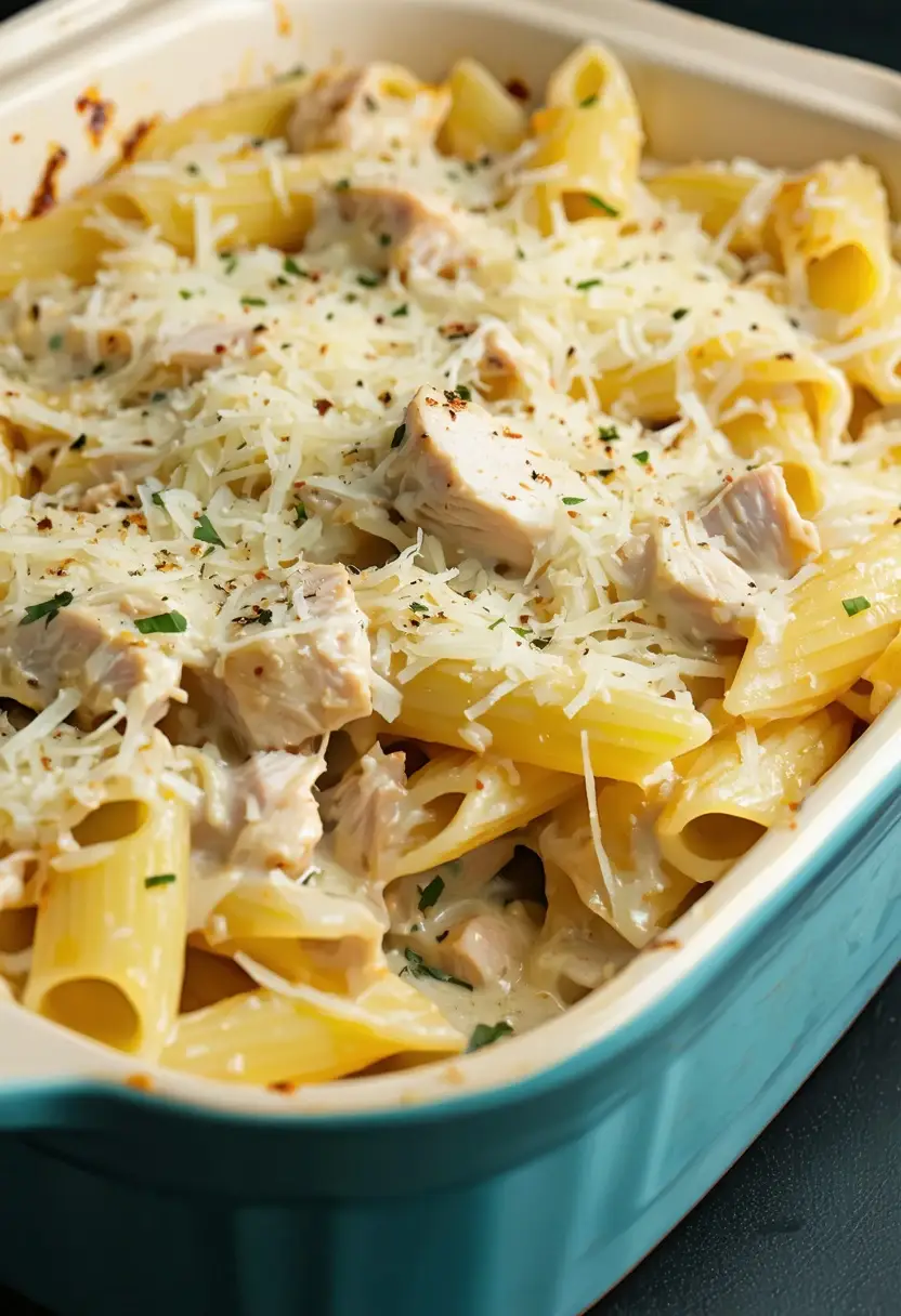 Uma casserola cremosa e reconfortante de frango Alfredo, perfeita para um jantar em família.
