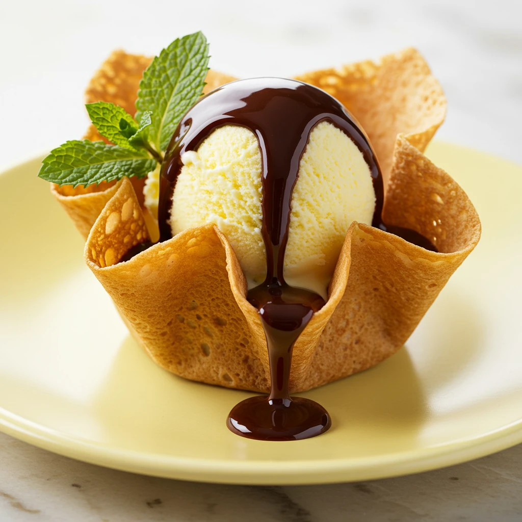 Deliciosas cestinhas crocantes de pão Rap10, recheadas com brigadeiro cremoso e bolas de sorvete de creme. Uma sobremesa fácil e irresistível para surpreender seus convidados!
