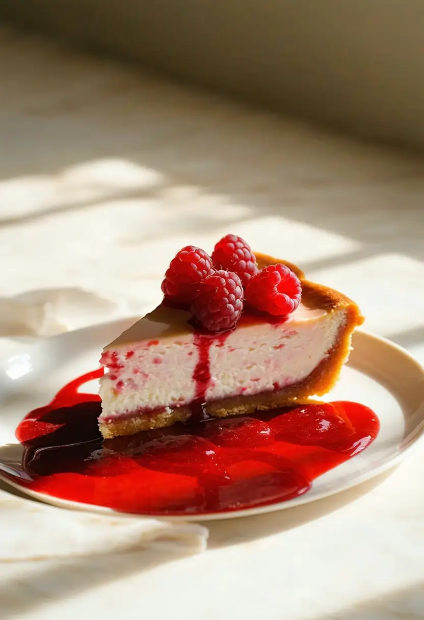 Um cheesecake de framboesa rico e cremoso com uma crosta de biscoito de graham amanteigada, perfeito para qualquer ocasião.