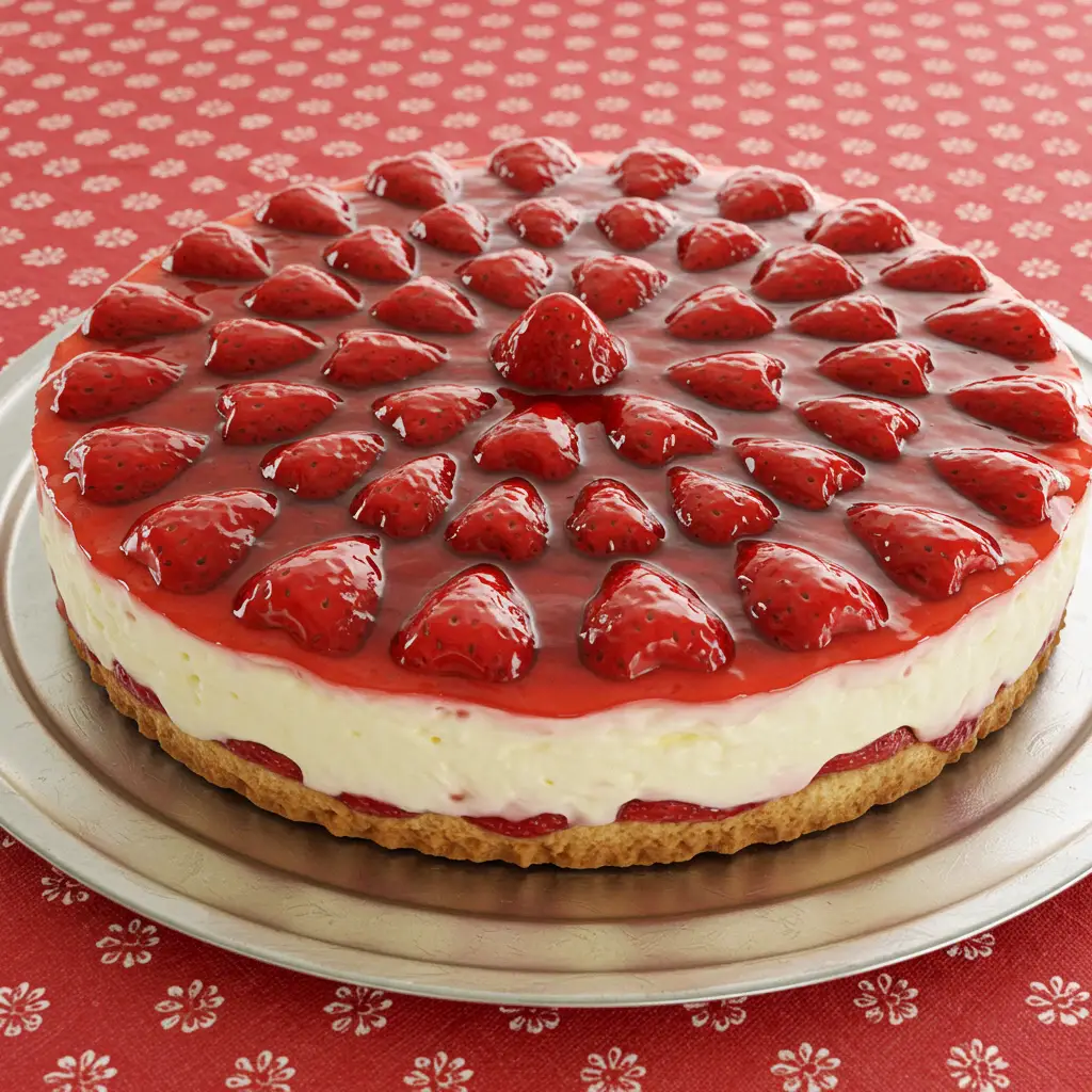 Delicioso cheesecake com base de biscoito Maisena, cremoso recheio de cream cheese e irresistível cobertura de geleia de morango. Uma sobremesa perfeita para encantar seus convidados!