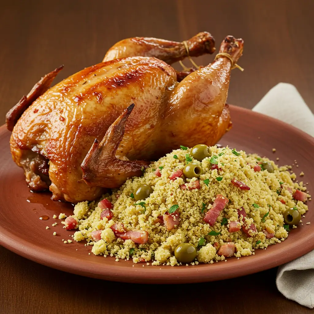 Chester suculento assado com perfeição, acompanhado de uma farofa deliciosa com azeitonas pretas e verdes, bacon crocante e o sabor intenso do orégano. Uma combinação irresistível para um almoço ou jantar especial.