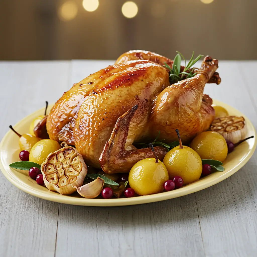 Um Chester suculento e saboroso, assado com peras macias em um delicioso molho de vinho branco, mel e especiarias. Uma receita perfeita para ocasiões especiais!