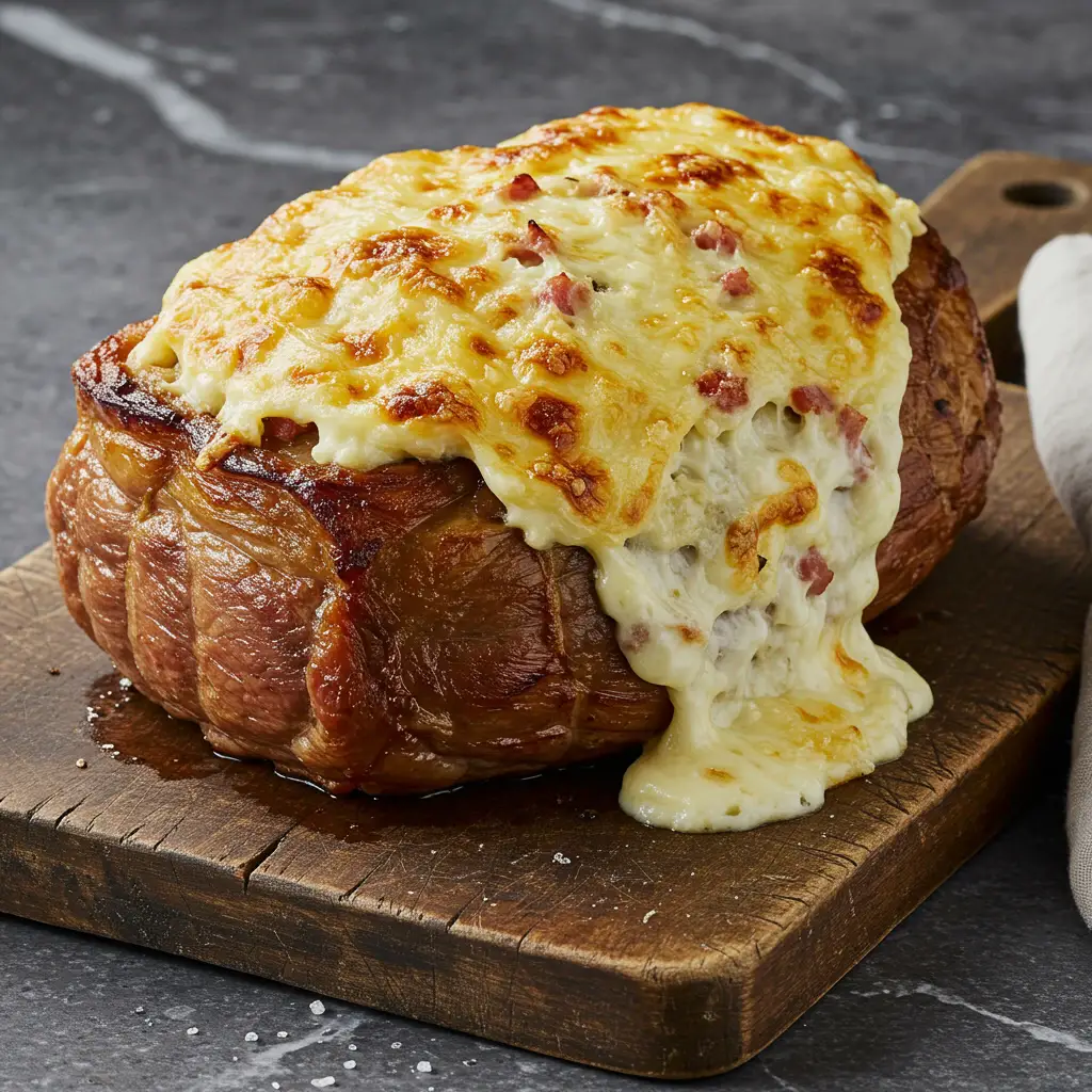 Chester suculento coberto por um gratinado cremoso de queijos, bacon e azeitonas. Uma receita deliciosa e fácil de preparar para um jantar especial.