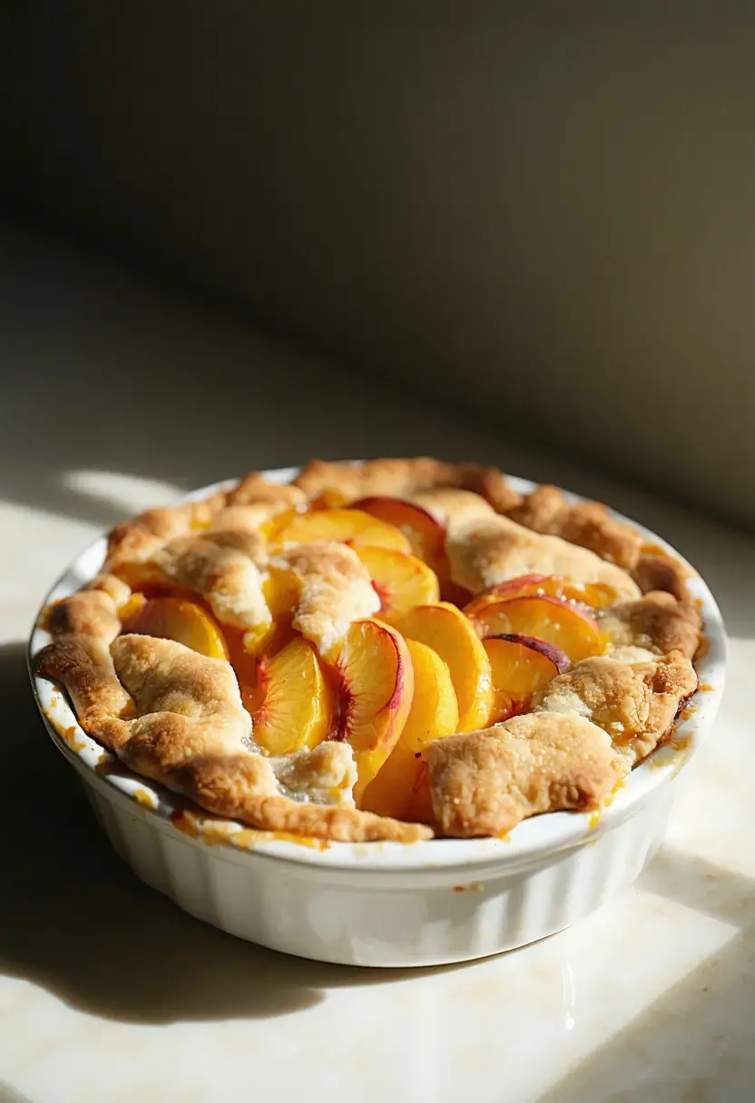 Uma cobertura simples e deliciosa de pêssego com uma crosta dourada e pêssegos suculentos. Perfeito para os amantes de sobremesas!