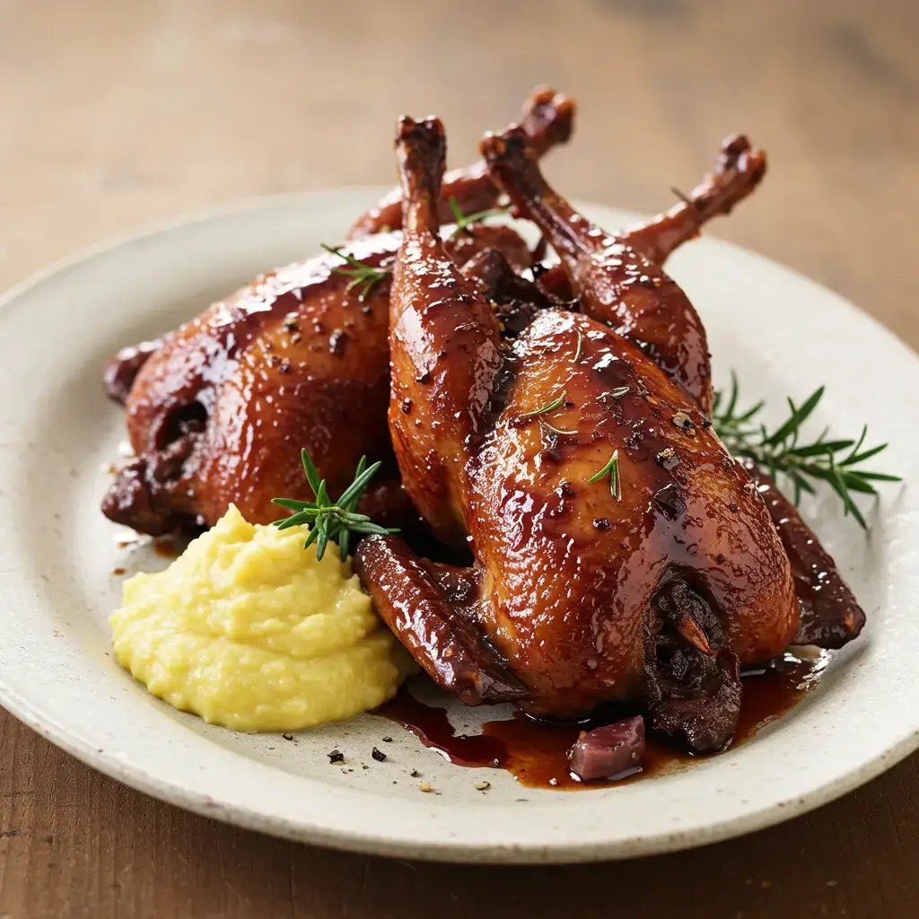 Deliciosas codornas marinadas em vinho branco e finalizadas com um irresistível molho de vinho tinto reduzido com suco de uva e alecrim. Uma experiência gastronômica inesquecível!