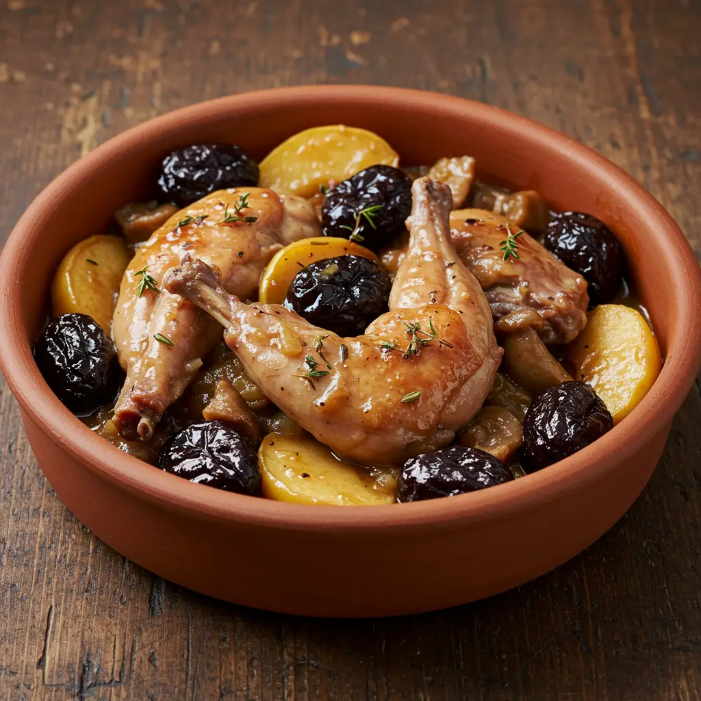 Um coelho suculento, cozido lentamente em vinho branco, com o sabor defumado do bacon e o toque doce das ameixas secas. Um prato sofisticado e reconfortante, perfeito para uma ocasião especial.