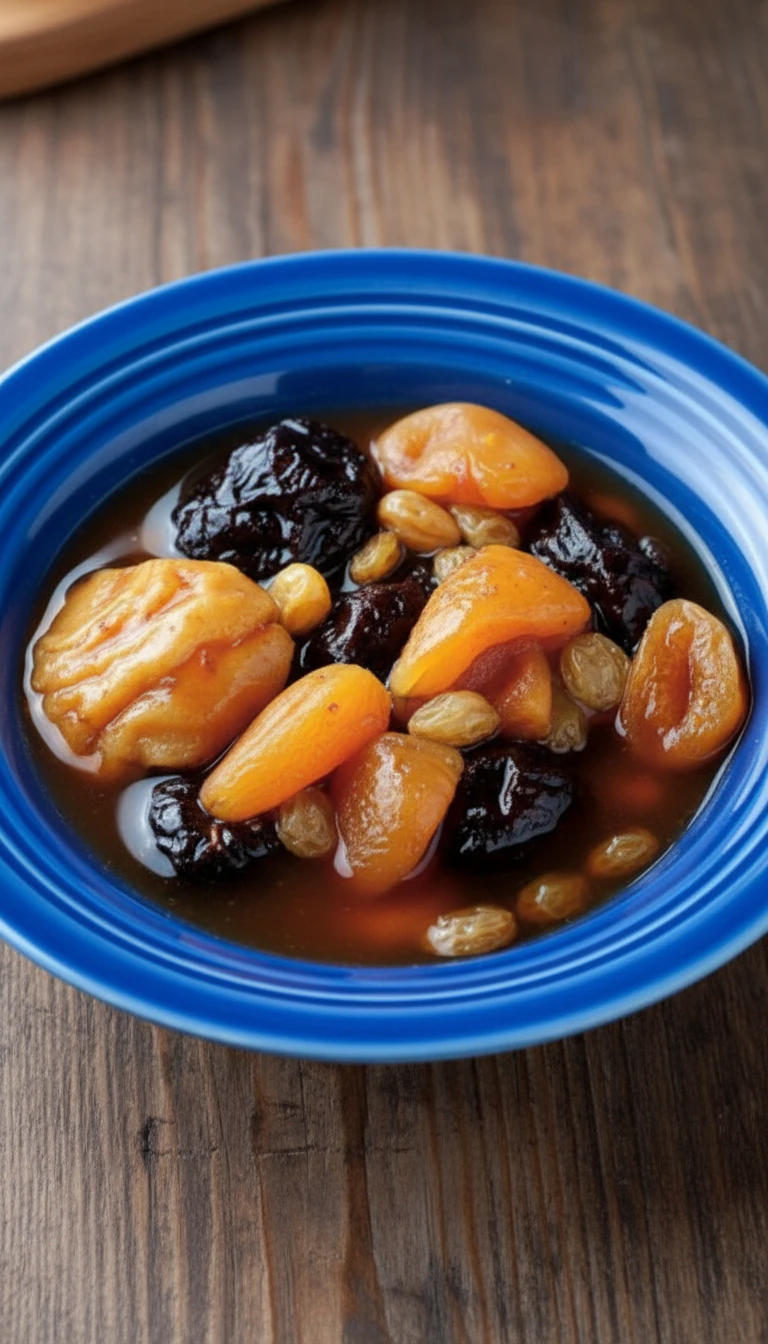 Em uma panela grande (com capacidade para 6 litros), misture a água, as frutas (pêra, figo, damasco, pêssego, tâmara), a ameixa preta e a uva passa.