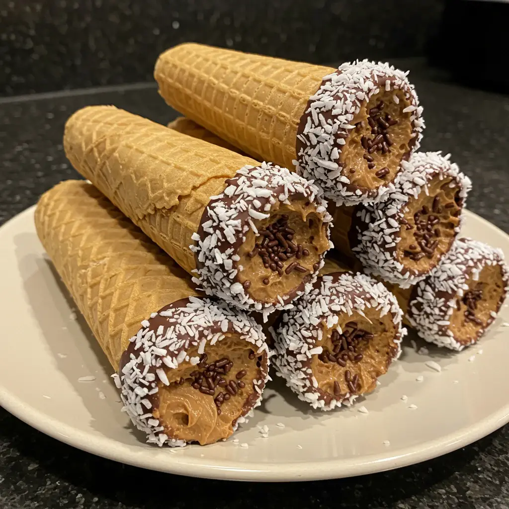 Deliciosos cones de cascão recheados com um cremoso brigadeiro de coco, cobertos com chocolate e coco ralado. Uma sobremesa irresistível e perfeita para qualquer ocasião! Experimente!