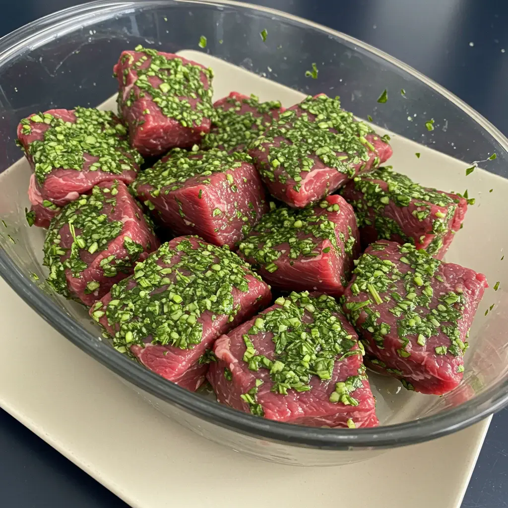 Tempere o contrafilé generosamente com alho, sal e cheiro-verde, espalhando bem por toda a peça. Reserve.