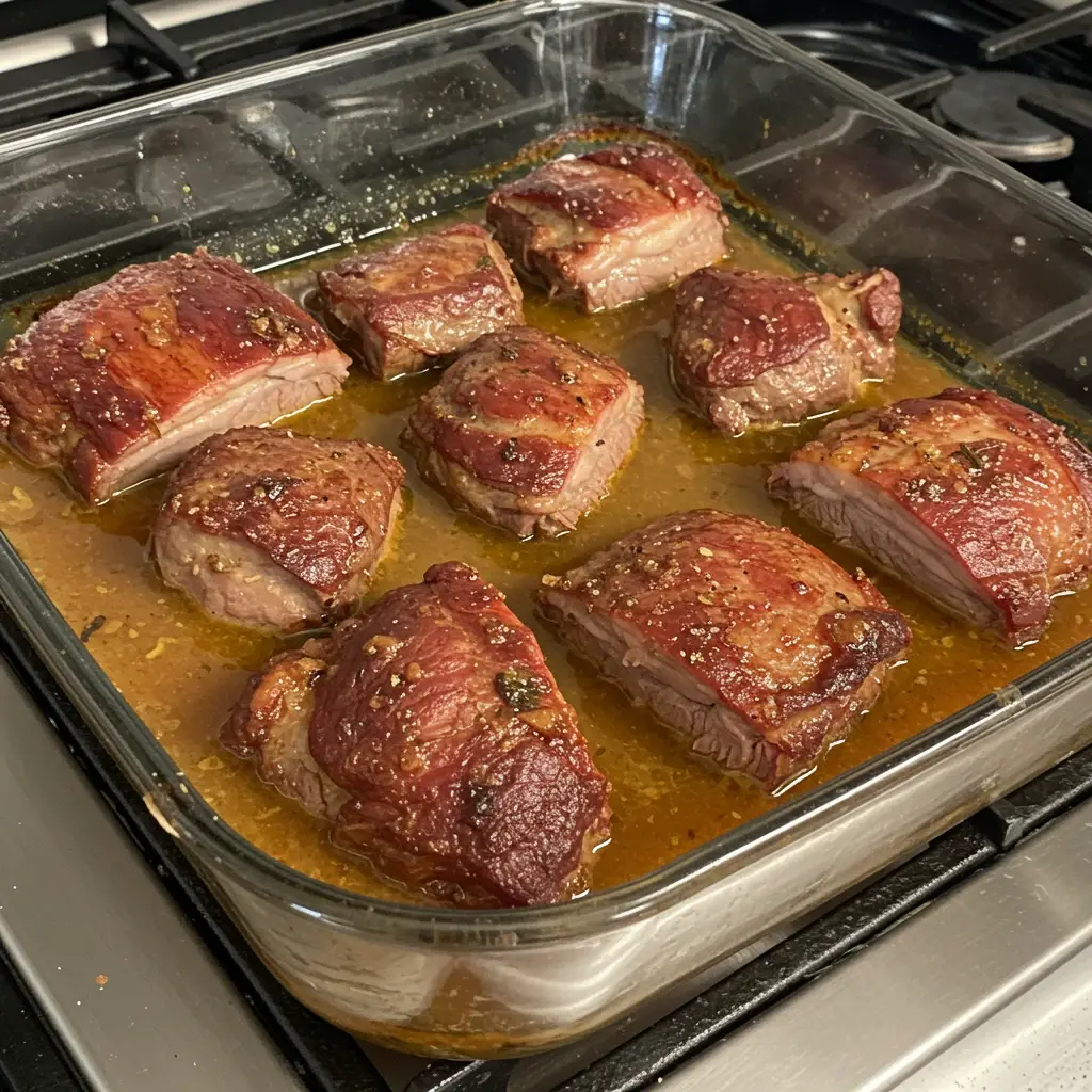 Após o cozimento na pressão, retire a costela e coloque em uma assadeira. Adicione o bacon reservado por cima.