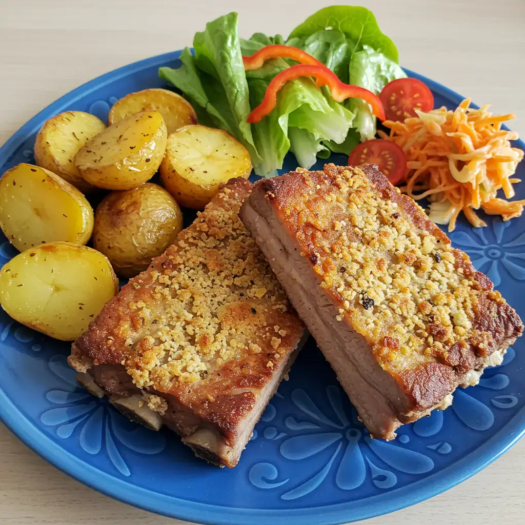 Uma costela crocante por fora e suculenta por dentro, perfeita para um almoço em família! Acompanhada de batatas assadas e uma salada fresca, um verdadeiro banquete brasileiro.