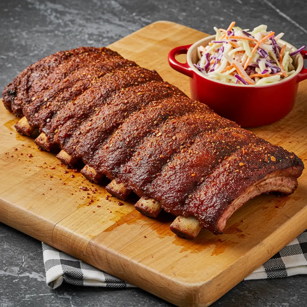 Costelinha assada com um saboroso rub, acompanhada de uma refrescante salada de repolho roxo e branco. Uma combinação perfeita de sabores e texturas para uma refeição deliciosa e completa.