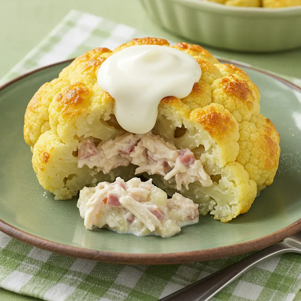Uma receita deliciosa e prática! Couve-flor macia, recheada com um saboroso mix de frango desfiado, bacon crocante e queijo derretido. Uma explosão de sabores que vai conquistar o paladar de toda a família.