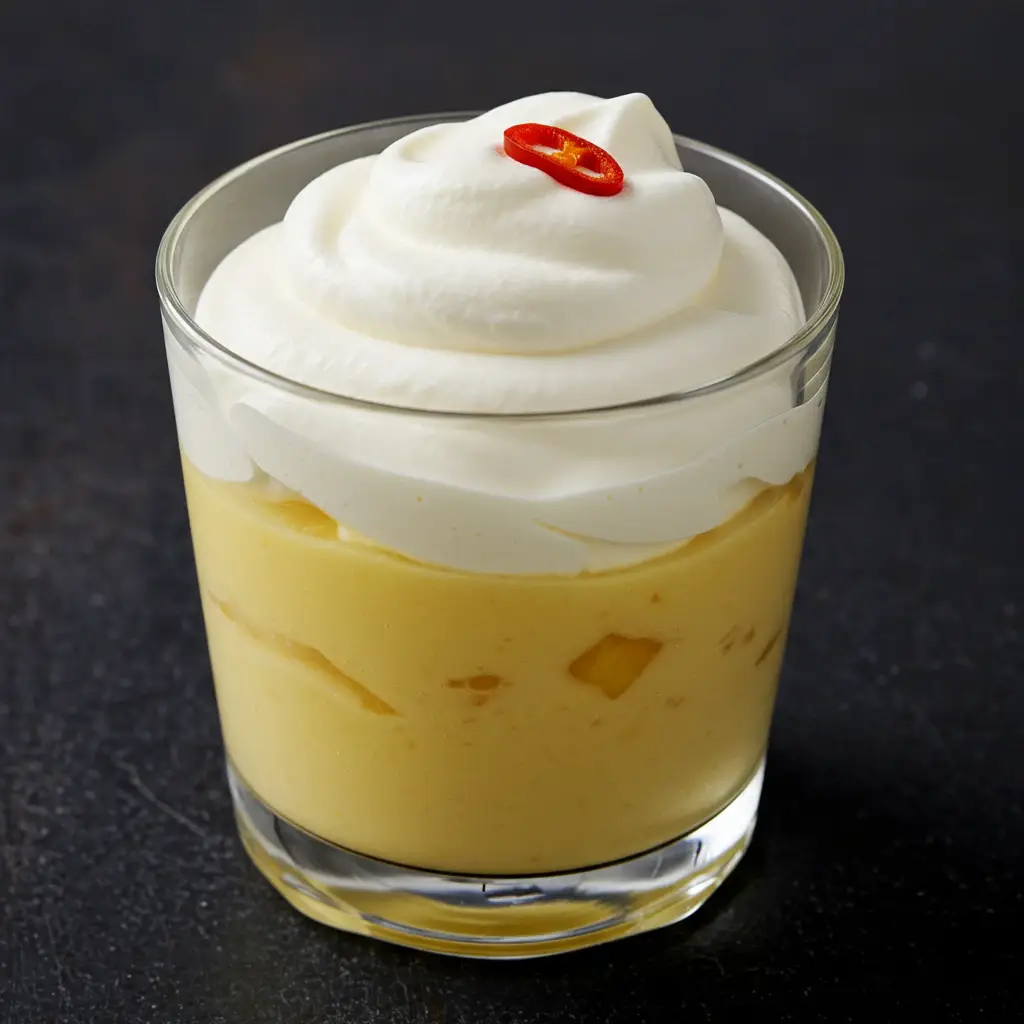 Decore o creme de abacaxi com o chantilly e finalize com folhinhas de hortelã ou fatias de pimenta dedo-de-moça (opcional).