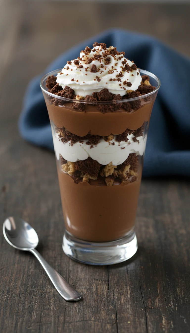 Em taças individuais, intercale camadas do creme de chocolate, do biscoito picado e do restante do chantilly.