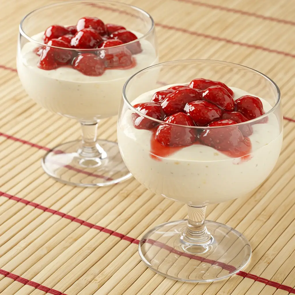 Um creme leve e refrescante de iogurte, com o toque doce e delicado da calda de morangos frescos. Perfeito para um lanche da tarde ou sobremesa leve.