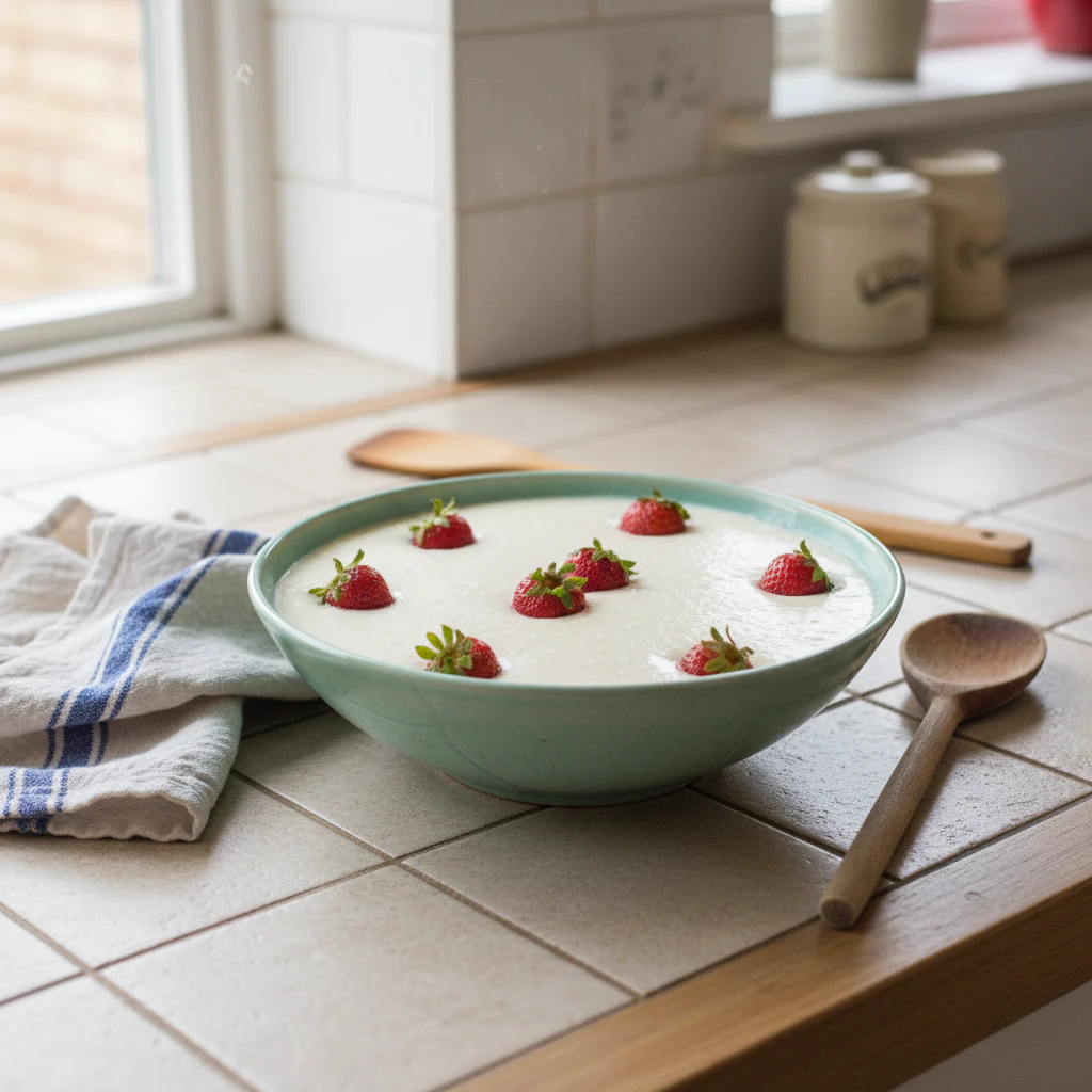 Decore com morangos frescos e leve à geladeira por pelo menos 2 horas antes de servir.