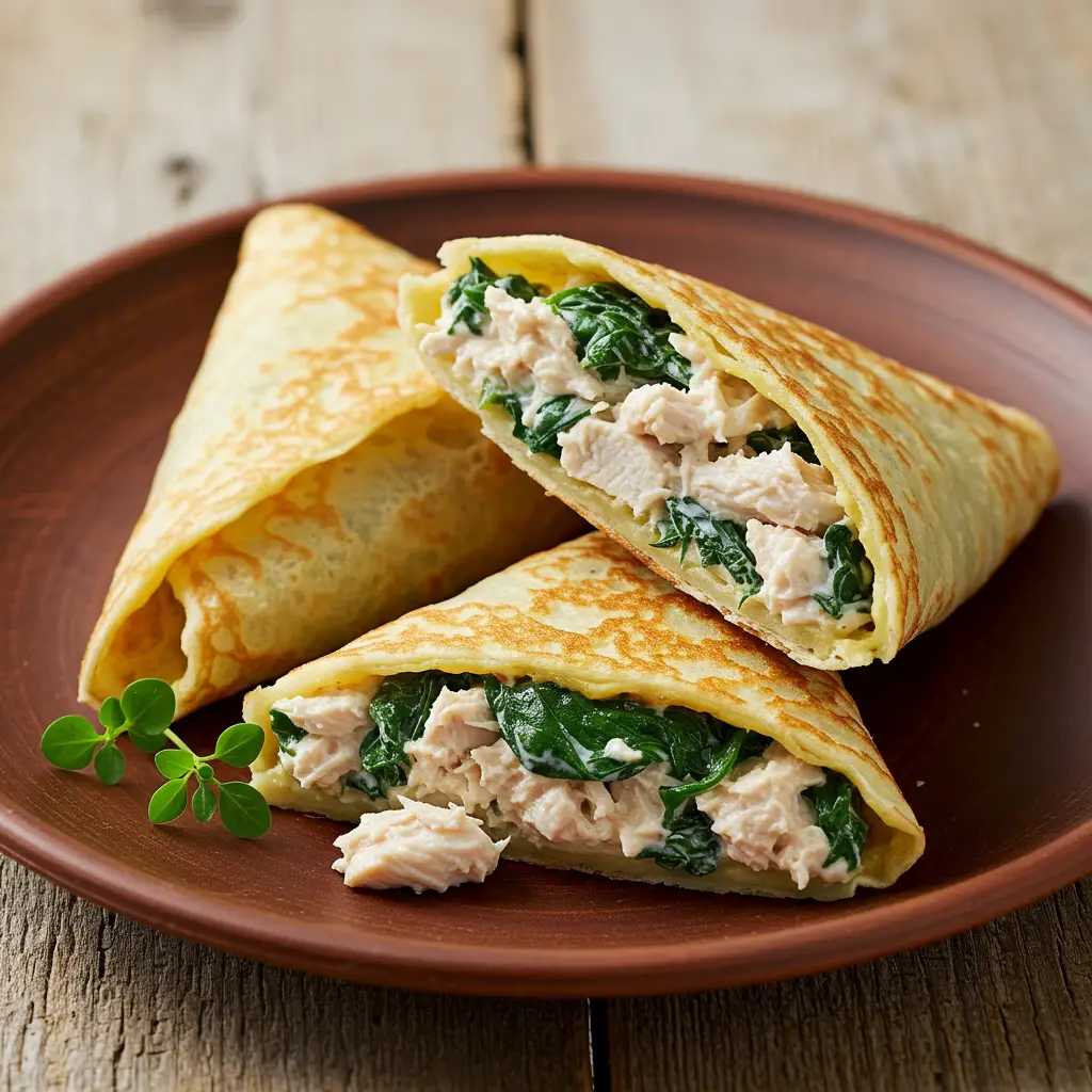 Deliciosos crepes de pão folha recheados com um saboroso frango ao molho de tomate e espinafre, finalizados no forno. Uma receita prática e saborosa para um jantar especial.