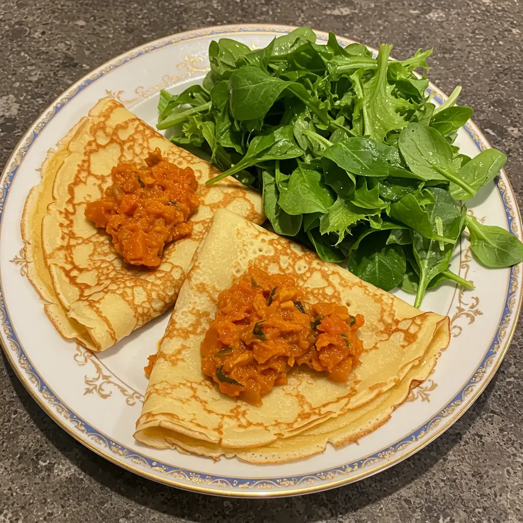 Deliciosos crepes finos recheados com um suculento frango ao molho de vinho tinto, finalizados com ervas frescas. Uma explosão de sabores da culinária brasileira!