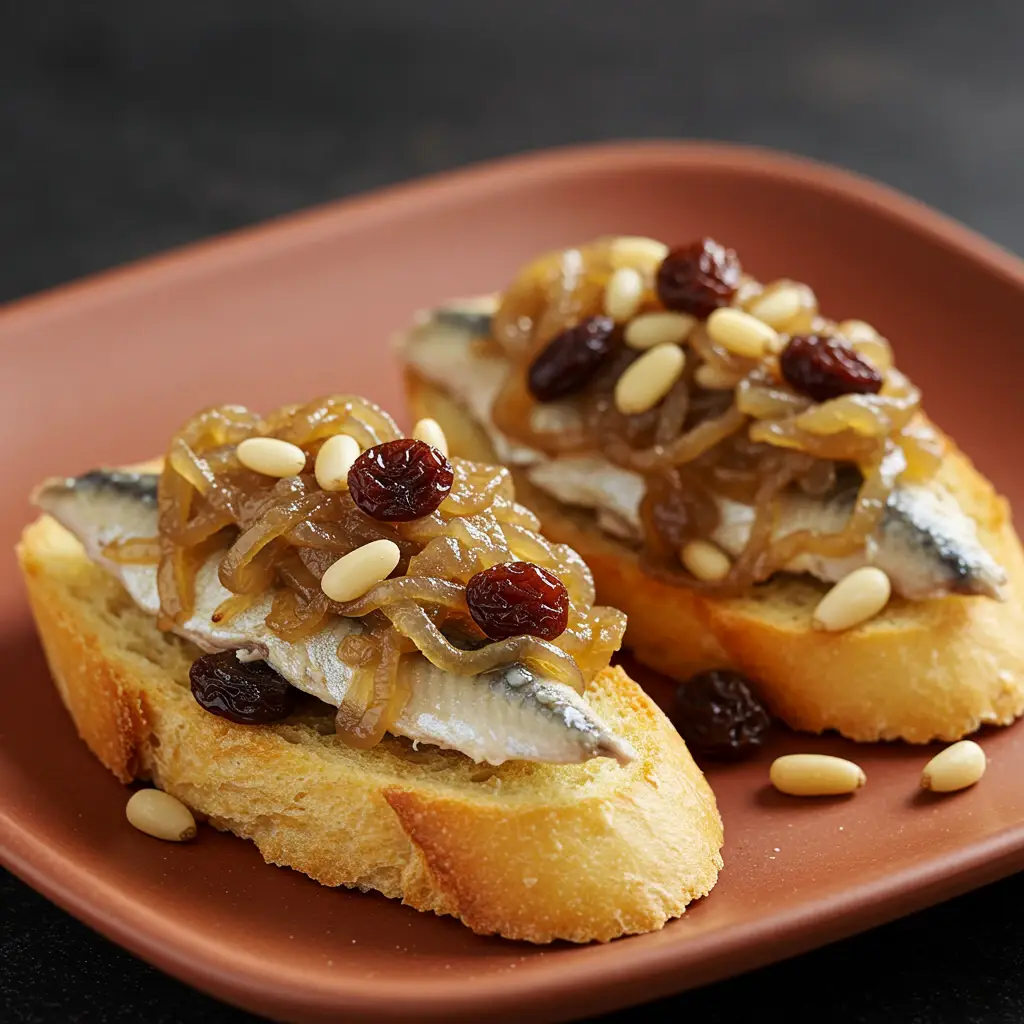 Deliciosos crostinis crocantes, com saborosas sardinhas marinadas em uma mistura aromática de cebola, uva passa, pinolis e vinagre. Uma entrada sofisticada e fácil de preparar!